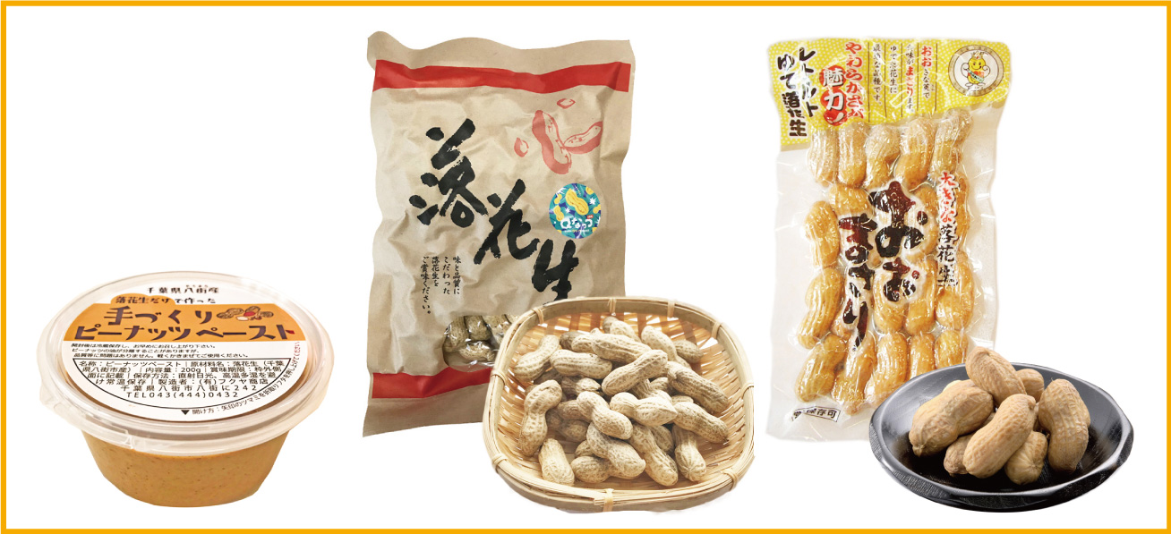 左:手づくり無糖ピーナッツペースト。中:甘みの強い品種「Qなっつ」。右:大粒品種「おおまさり」の茹で落花生のレトルトパック。すべて落花生の産地、千葉県八街市で落花生製品の卸・小売を行っているフクヤ商店さんの製品です。落花生の一大産地、千葉県の落花生の味わいを楽しんでいただける詰め合わせです。※製品写真の大きさは比例しません。