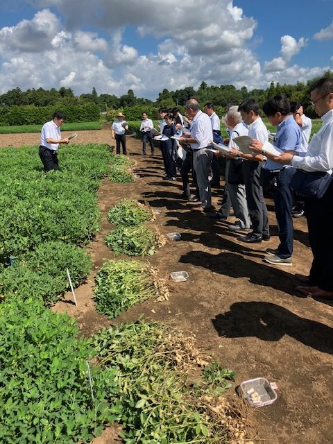 昨年度は、高温、乾燥の影響により、品質の低下がみられましたが、本年度は概ね順調な生育状況とのことであり、当日参加した50名の関係者は、千葉県農林総合研究センター落花生研究室(千葉県八街市)の圃場において、主要落花生品種の生育状況を実際に確認し、意見交換を行いました。