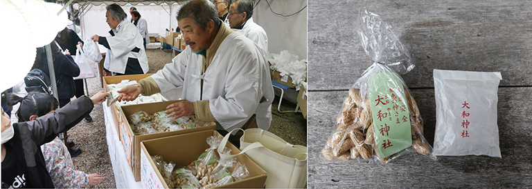 2日15時頃、大和神社を訪ねると、拝殿前の参道脇にテントが据え付けられ、白地のはっぴを着た方々が待機しておられました。この方々は、大和神社を氏神神社とする9つの地域の氏子代表だそうで、ずっと昔から節分祭のお手伝いをされているのだそうです。テント下のテーブルには、落花生と大豆、2種類の福豆が用意されていました。天理市では、北東部・福住町あたりで落花生栽培が行われているそうで、収穫時期になると道の駅などに生の落花生が並び、すぐに売り切れる人気ぶりなのだとか。