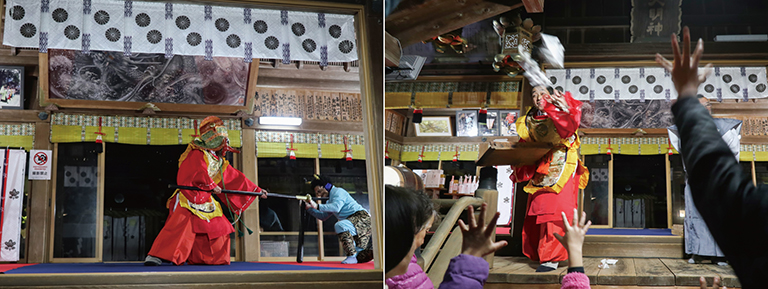 写真上:氏子代表の方々が扮した鬼を取り囲んだ子どもたちからは歓声が。保護者の方々も参加され、楽しい雰囲気に満ちていました。写真下:猿田彦大神が鬼退治をするシーン。この後、立ち上がった鬼たちと猿田彦大神は手を取り合い、仲直りをアピールしていました。