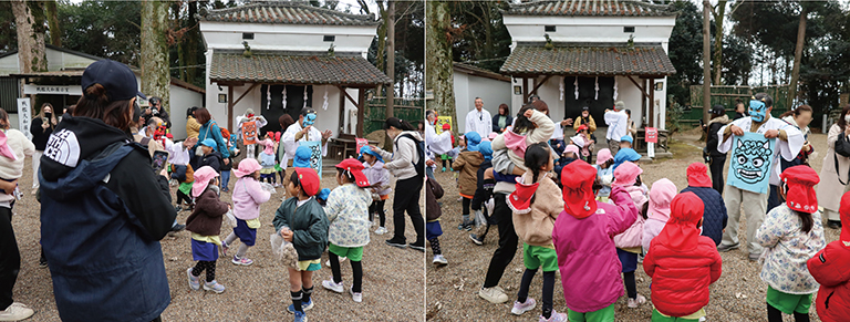 子ども節分祭をつくり上げるのも氏子代表の方々で、開始1時間前にはすっかり準備が完了していました。あちこちの木などに災いを記した鬼の顔の絵が付けており、それに向けて子どもたちが豆まきを行うのです。神社に到着した子どもたちは、まず、保育士さんの指導でていねいにお参りをしていました。そのあと、「鬼がいるよ。やっつけよう」という保育士さんの掛け声がかかり、子どもたちは鬼の絵をみつけると「あ、ここにいた」と声を上げながら、鬼退治を行っていました。続いて鬼のお面や絵をつけた氏子代表の方々が登場して、子どもたちの興奮が最高潮に達した頃、昨日、鬼やらい神事に登場した赤鬼青鬼が登場。怖くて泣きだす子もいるほどの演技でした。その後、昨日同様に猿田彦大神が登場して無事に鬼退治をすると、年長の子どもたちや保護者と保育士の方々から拍手が起きていました。