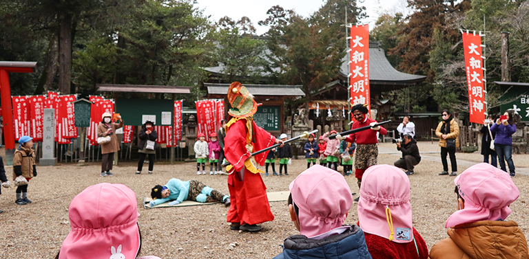子どもたちが落花生をまいて鬼やらい。地域でつくり上げる、奈良・大和神社の節分祭と子ども節分祭