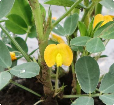落花生の最も大きな特性は、地中で実ること。蝶が羽を広げたようなかたちの鮮やかな黄色の花が咲き、花が萎れたあとから「子房柄(しぼうへい)」と呼ばれる茎のような器官が伸びてきます。子房柄はやがて地中に潜り、その先端にある受精した胚が地中で実って落花生になります。