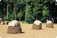 人の背丈ぐらいの高さの野積みで、「ボッチ」と呼ばれています。莢実の水分が10%程度になるまで、約1ヵ月間積んでおきます。落花生生産地独特の畑の風物詩です。