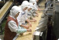 煎り豆に加工する原料は莢から実を取り出し、加えてバターピーナツに加工する原料は湯の中を通して薄皮を取り除きます。